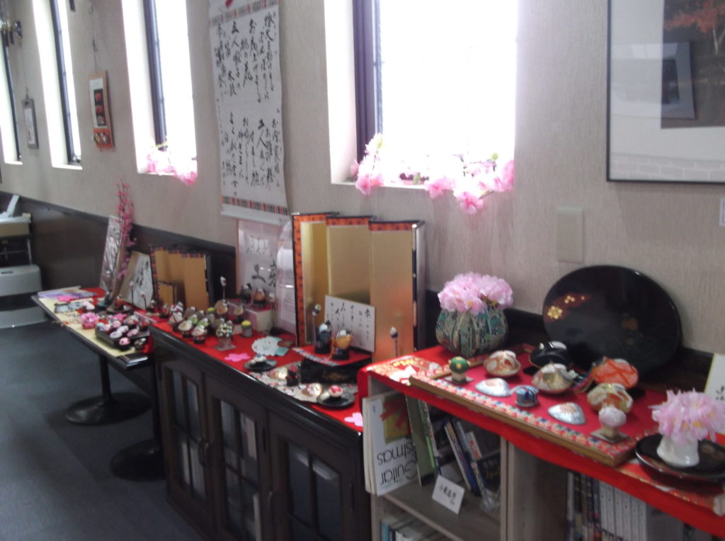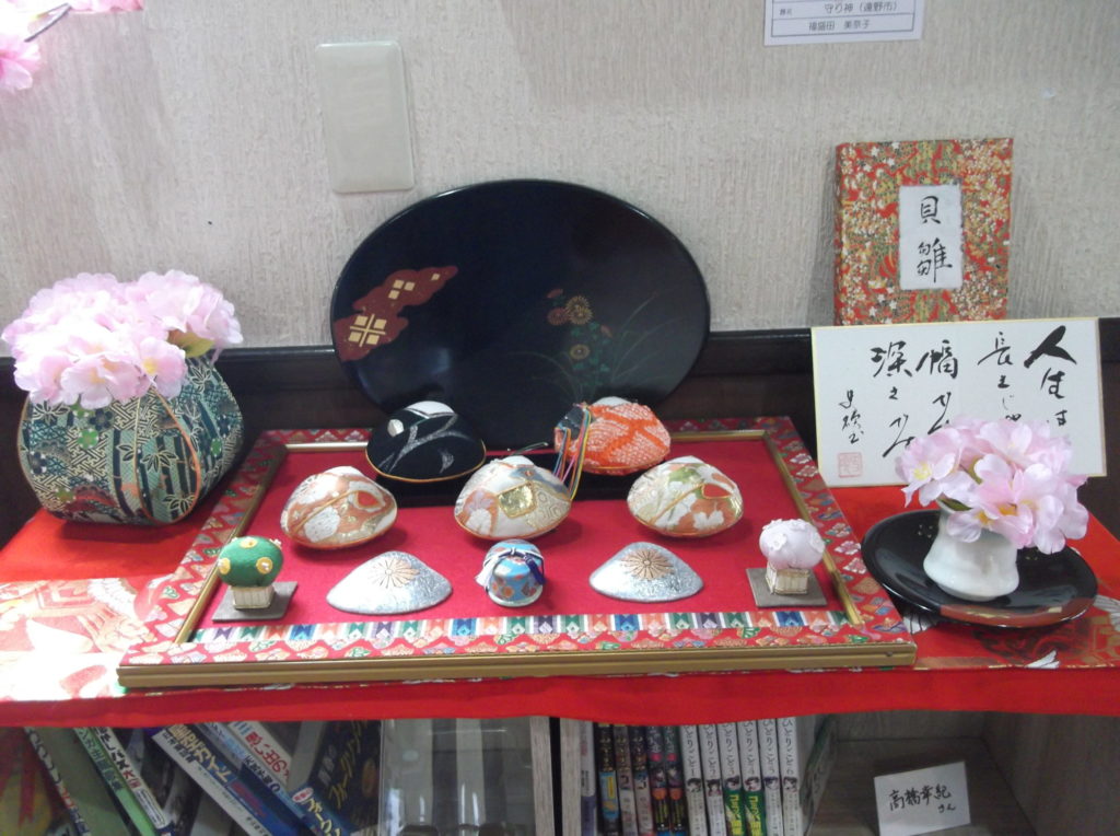 展示は、貝の雛人形・雛飾りに桜の花びらをあしらって,初春の風物を絢爛に設えています。